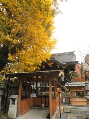 菅原院天満宮神社は、本殿わきに大イチョウが植えられています。境内の外からでも目立つイチョウで、晩秋に黄葉した姿を見ると吸い込まれるように参拝したくなります。